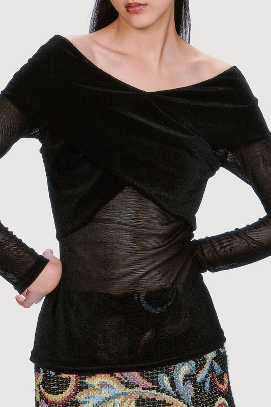 Velvet Mesh Off the Shoulder Top - Black
