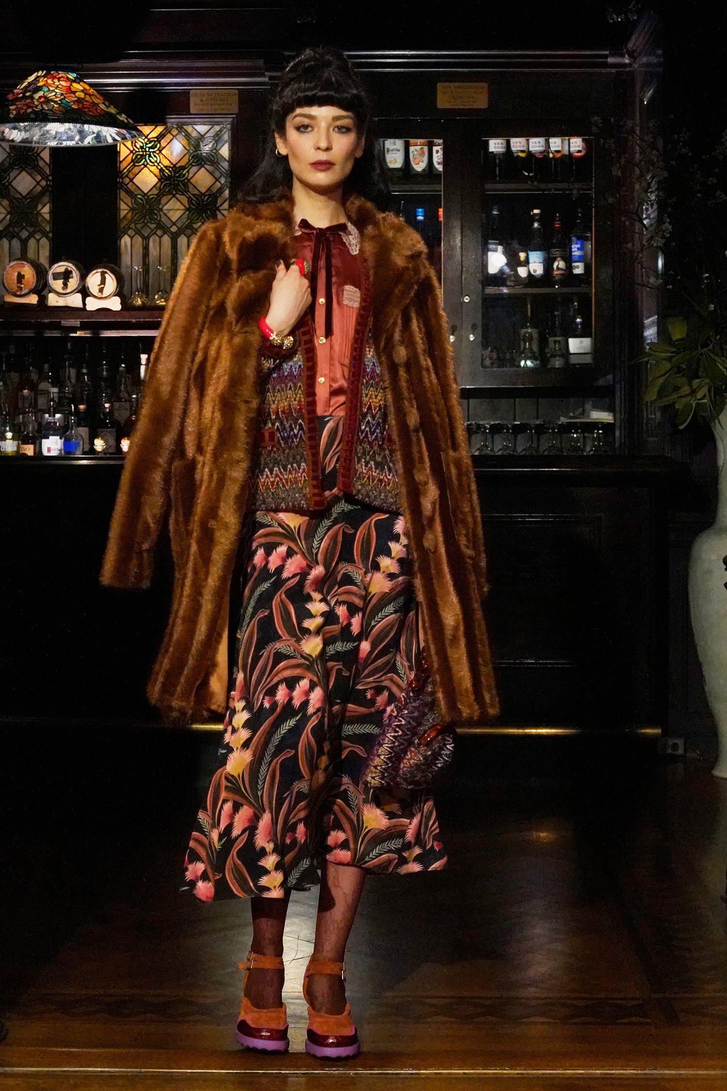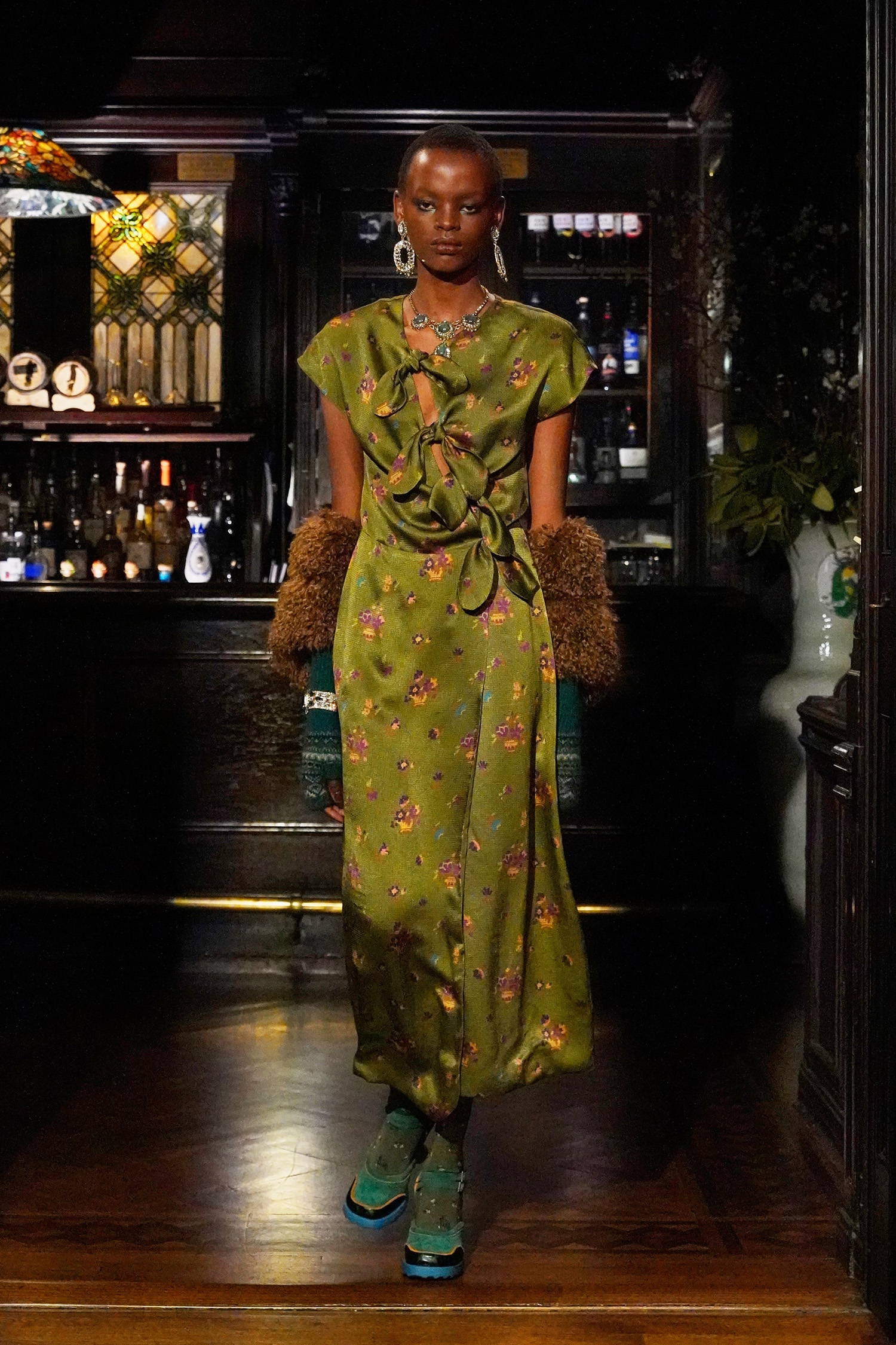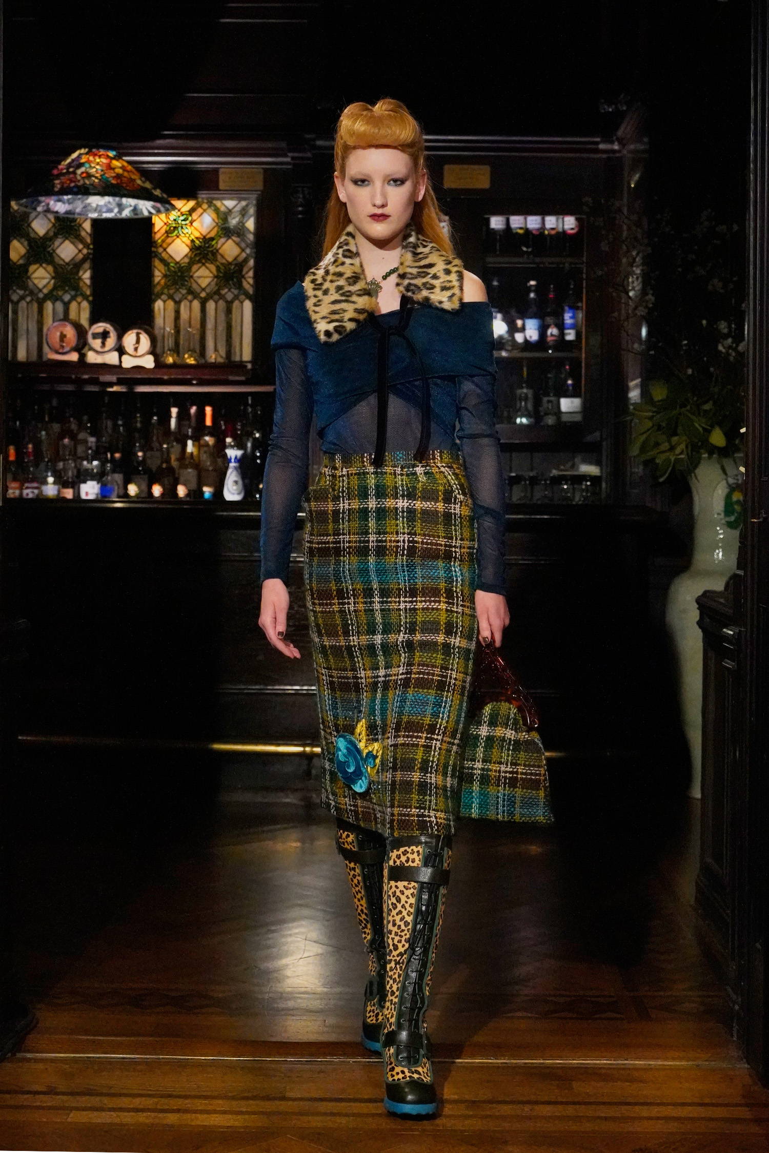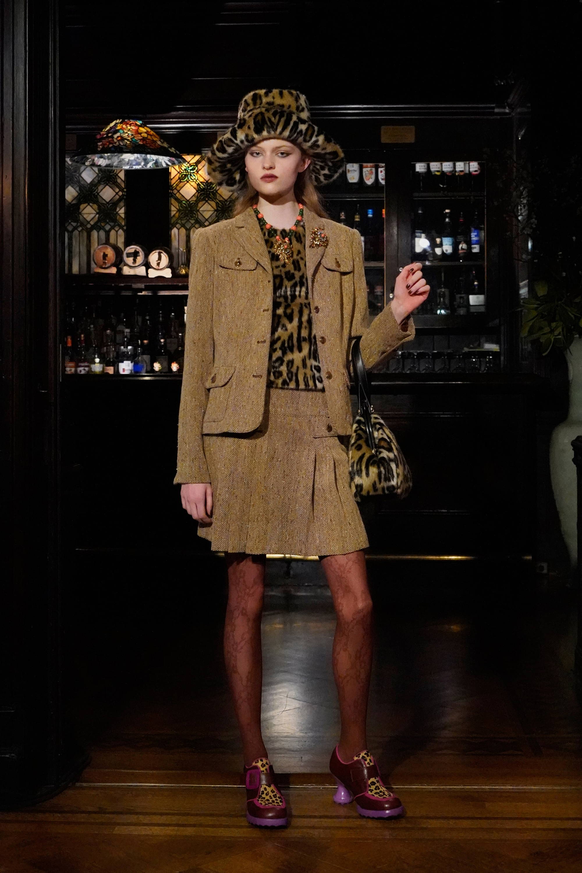 Given Sui’s enduring reverence for and reference of all things fantasy, these madcap heiresses allowed her to weave together rich textures, fabrics, and faux furs into a collection with three distinct color stories: teals and greens, magentas and russet browns, and purples and black. Fabrics range from tweed-y plaids, heavy hammered satin, faux fur trims in Mongolian and leopard. Jewelry and accessories were also a focal point of reference given that heiresses like Hutton had a soft spot for jade and Guggenheim was known for her outlandish glasses. Sui worked with jewelry designer, Erickson Beamon to make the pieces look as real as possible, straddling glamour and irony alike as Sui’s madcap heiresses cheekily lollygag through their castles in the sky. For footwear, Sui worked with longtime collaborator John Fluevog to create custom sneakers featuring a rubber sole in three colorways, each reflecting the respective color palettes, along with a knee-high leopard print boot and buckle shoe, and a double strap Mary Jane.