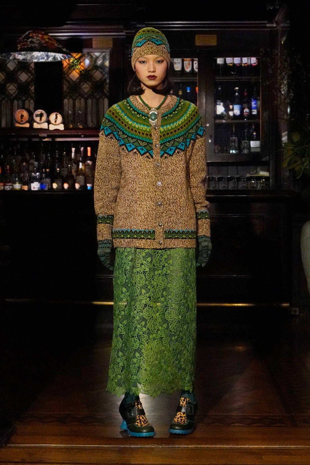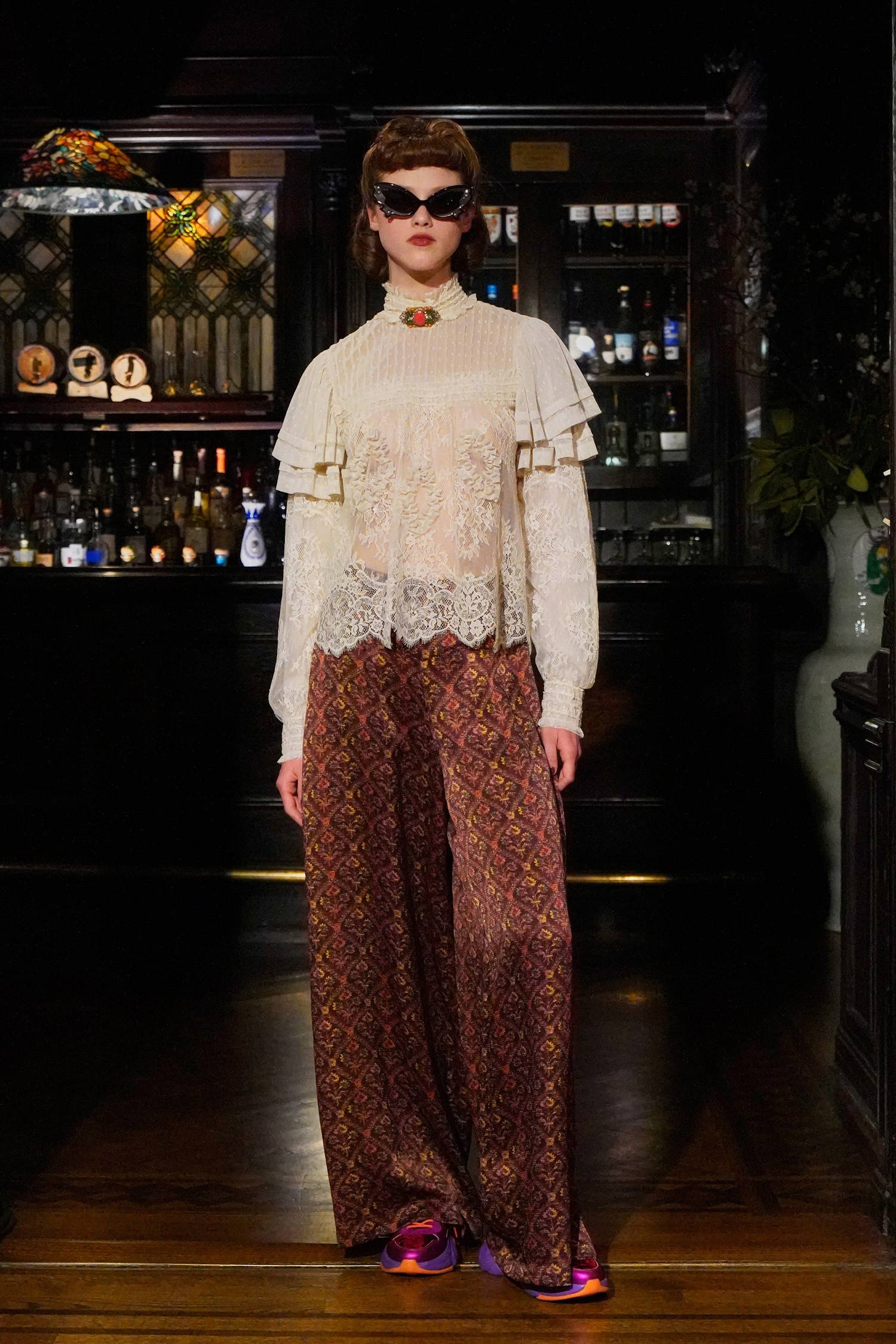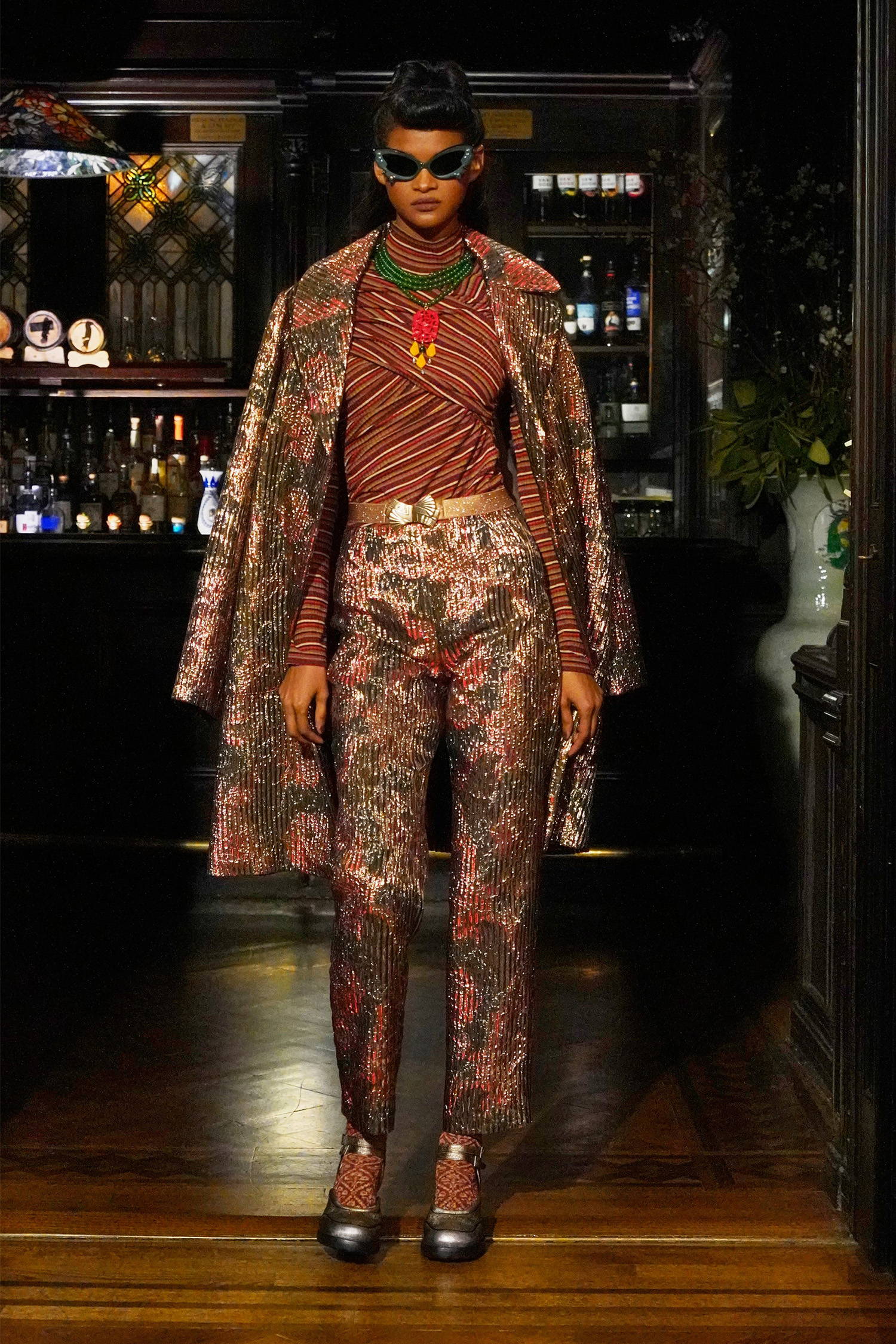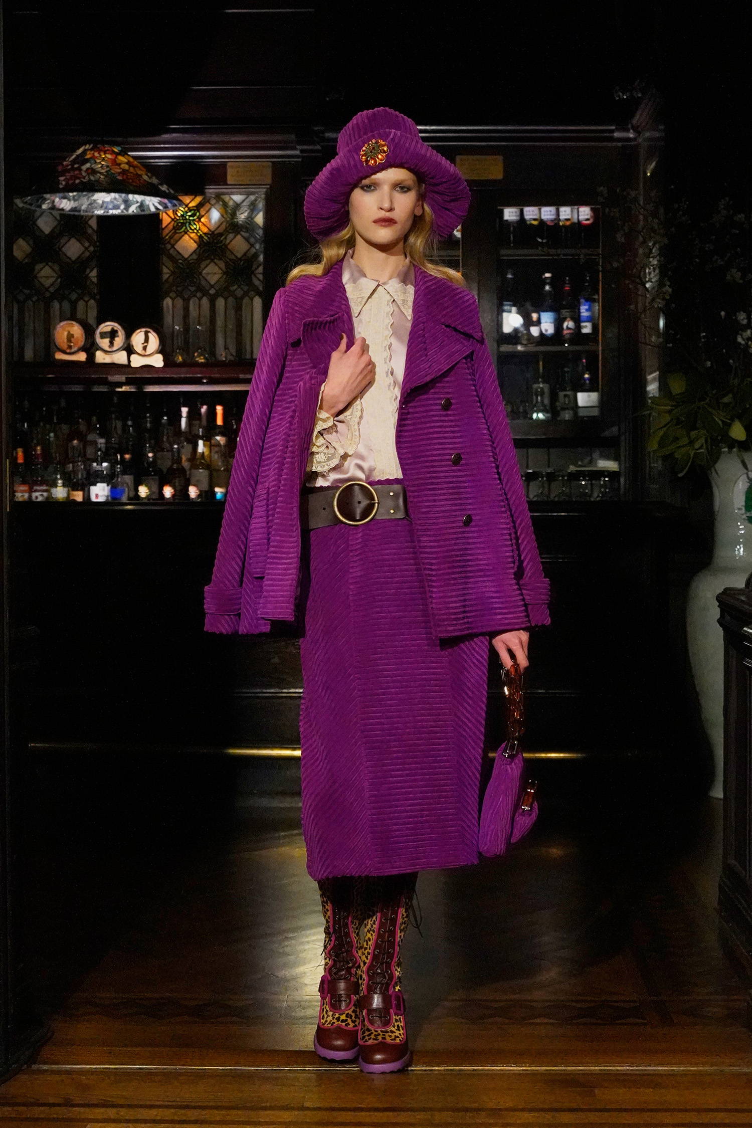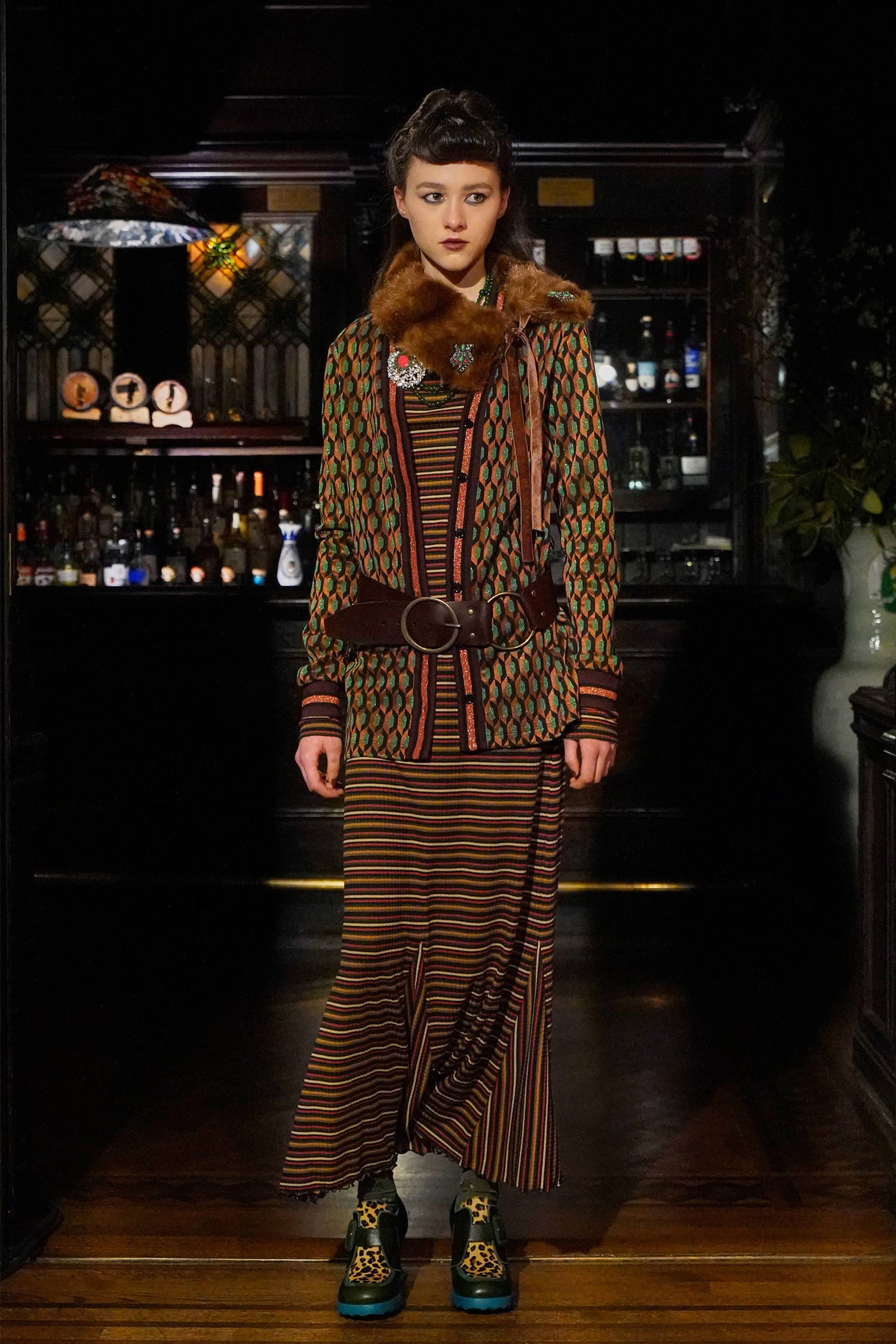 Given Sui’s enduring reverence for and reference of all things fantasy, these madcap heiresses allowed her to weave together rich textures, fabrics, and faux furs into a collection with three distinct color stories: teals and greens, magentas and russet browns, and purples and black. Fabrics range from tweed-y plaids, heavy hammered satin, faux fur trims in Mongolian and leopard. Jewelry and accessories were also a focal point of reference given that heiresses like Hutton had a soft spot for jade and Guggenheim was known for her outlandish glasses. Sui worked with jewelry designer, Erickson Beamon to make the pieces look as real as possible, straddling glamour and irony alike as Sui’s madcap heiresses cheekily lollygag through their castles in the sky. For footwear, Sui worked with longtime collaborator John Fluevog to create custom sneakers featuring a rubber sole in three colorways, each reflecting the respective color palettes, along with a knee-high leopard print boot and buckle shoe, and a double strap Mary Jane.